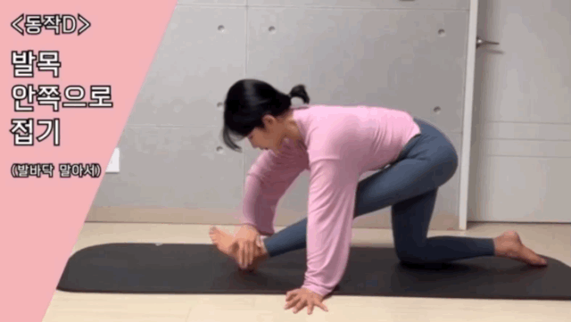 动作D:根据之前C的动作稍有不一样,脚趾要向内扣,要有绷起脚背的感觉。同样十次,左右互换。