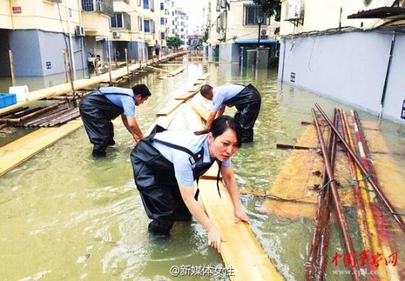 近日江浙沪终于走出梅雨季,而就在7月初,暴雨使江苏省宜兴市龙泽苑变成一座小型“威尼斯”。宜兴市公安局环科园派出所女民警陈茜,在天蒙蒙亮时,就带领警辅子在“河面”铺设安全通道,一直忙到晚上9点才吃到了当天第一顿饭。