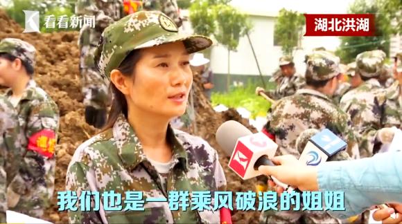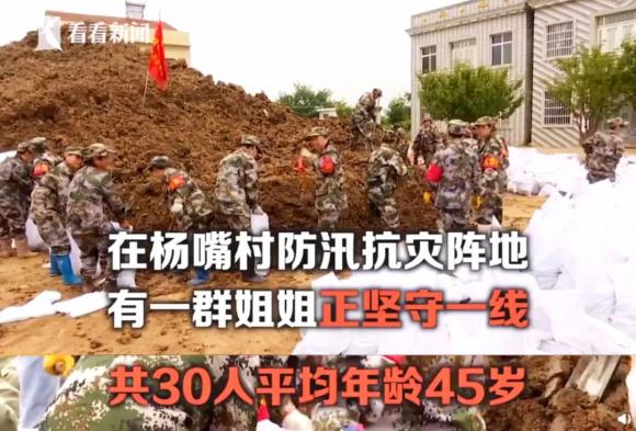 在杨嘴村防汛抗战一线,有一支特别的队伍。她们平均年纪45岁,穿着迷彩服,盘起了长发。不知道的人,看着她们的背影,还以为是20出头年轻的子弟兵。