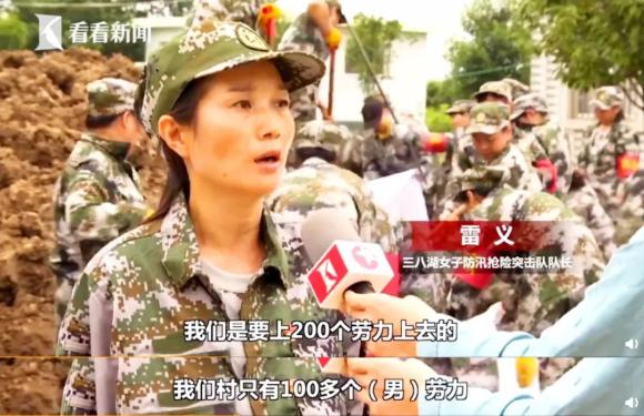 她们是杨嘴村当地的妇女临时组建的抢险突击队,“防汛要求需要200个劳力,但是村里一共才只有100多的壮汉,所以‘妇女就要顶半边天’。”