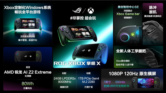 尽掌控,超会玩!首款纯血XBOX掌机,ROG XBOX掌机X于北京时间10月16日15:00正式发布,并于当天晚21:00正式开售,首发价6499元。ROG此次联合微软XBOX团队,实现多点定制,带来Xbox全屏体验、Xbox定制化系统、全新人体工学握把等多项创新设计,实现纯血进化。同时首发搭载AMD锐龙AI Z2 Extreme处理器、配备7英寸1080P 120Hz原生横屏、内置80Wh电池,内外全面升级,赋予玩家全新掌机体验。