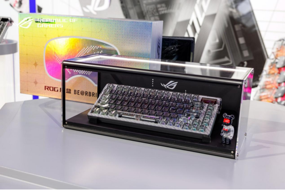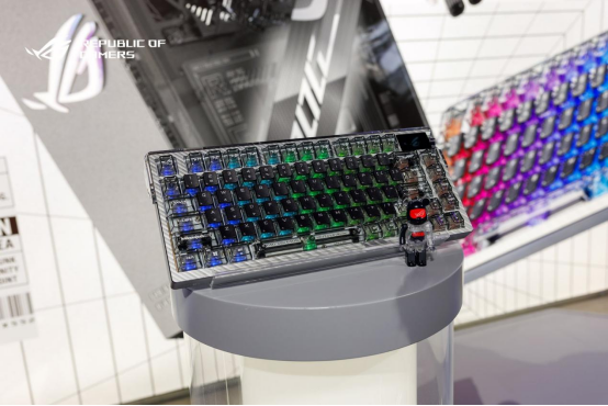 最后,我们来看看本次新品超玩会上亮相的透明键盘—ROG夜魔Extreme Special Edition键盘,搭载了全新定制的NX透明轴壳,有效提升键盘的透明质感,脚撑、掌托底板等小部件也采用透明设计,与整体风格相得益彰。