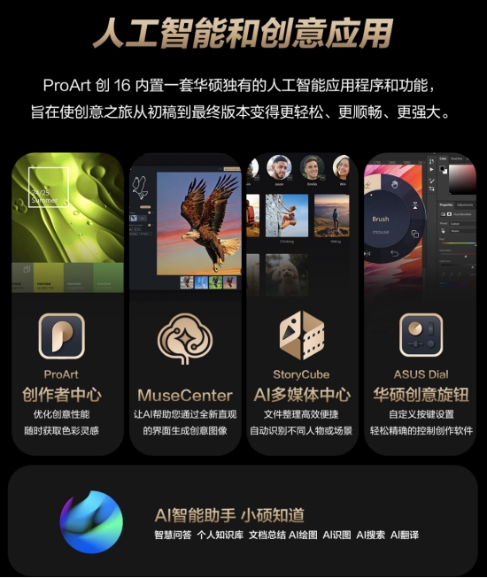 华硕ProArt 创16 2025还内置了多个创新AI工具,包含“小硕知道”AI智能助手、MuseCenter AI图像生成应用、StoryCube AI多媒体中心、华硕创意旋钮以及ProArt创作者中心。这些AI应用不仅为创作者提供了丰富的创作灵感支持,帮助快速整理素材、生成创意思维图、进行图像识别、翻译以及文档总结等,极大提升工作效率。
