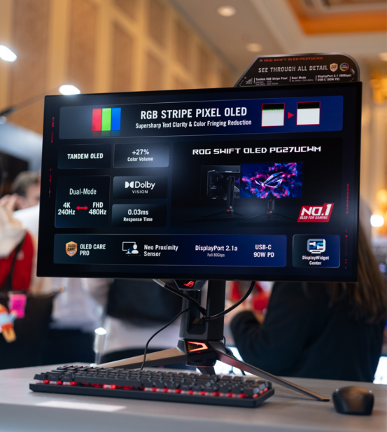作为本届CES 2026展会上的核心亮点之一,ROG推出的全新OLED电竞显示器ROG超神27二代,在技术方面做出了全新飞跃。它采用26.5英寸的主流尺寸设计,搭载了真RGB条状OLED技术与串联式Tandem OLED面板。前者去掉了传统WOLED面板中的白色子像素,采用真RGB条状OLED技术,色域容积提升高达27%,尤其在高亮度环境下,为玩家呈现更丰富、更鲜活的色彩表现。并且能够提供非常锐利清晰的文字,减少彩边干扰,方便玩家观看;后者则全方位提升了屏幕的性能。搭配Neo接近传感器,自动识别玩家与屏幕间的距离,自动切换黑屏或恢复原始桌面画面,以防止OLED面板烙印,贴心保护屏幕。