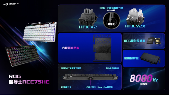 作为ROG玩家国度的重磅新品,ROG魔导士Ace 75 HE磁轴键盘无疑是电竞利器。其采用75%紧凑布局,节省桌面空间的同时,满足了电竞玩家对于功能与便携性的双重需求。还搭载了ROG HFX V2以及V2X磁轴,配合ROG霍尔传感器,可实现0.01mm精度,磁通量容错能力也得到显著增强,为玩家带来更为精准的操作体验。为满足玩家个性化需求,该键盘还支持热插拔,玩家可自由选择适配磁轴进行替换。而且回报率高达8000 Hz,大幅提升操作响应速度,让玩家的每一个指令都能迅速传达,游戏操作更加跟手。