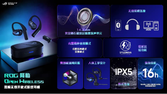 展会上另一款ROG降临OPEN WIRELESS双模无线开放式游戏耳机同样亮点十足。其内置14.2mm类金刚石碳涂层振膜发声单元,声音清晰自然。玩家可根据自身喜好,在幻影低音模式和沉浸模式两种音效模式中自由切换,满足不同游戏场景的需求。同时,还搭载了SpeedNova无线技术,在游戏开黑和运动通勤等场景下,都能实现低延迟低功耗的高性能表现。