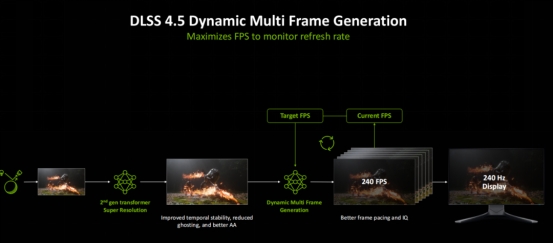 同时,DLSS 4.5采用了全新的动态多帧生成技术,相比DLSS 4的4倍多帧生成,它最高支持6倍多帧生成,可以大幅提升游戏流畅度,同时也能按照当前显示器的最高刷新率设置,以刷新率为帧率输出目标实时动态调整多帧生成,让最终帧率呈现与显示器刷新率设置保持一致。