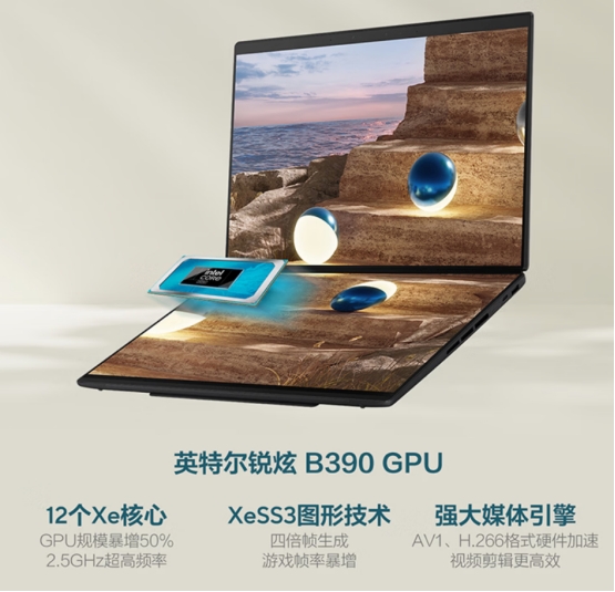 同时第三代英特尔酷睿Ultra X9处理器还内置了新一代英特尔锐炫B390核显,采用全新Xe3架构,配备12 Xe核显,GPU核心规模暴增50%,图形性能大幅提升;支持XeSS3多帧生成技术,可实现4倍帧率跃升,搭配实时光线追踪技术,光影细节细腻逼真,无论是轻度游戏娱乐,还是创意设计中的光影渲染,都能带来沉浸式视觉体验;支持AV1、H.266格式编解码加速,在保证画质的前提下实现更小体积的视频输出与更高效的素材处理,大幅缩短视频预览、渲染和导出时间,提升工作效率。