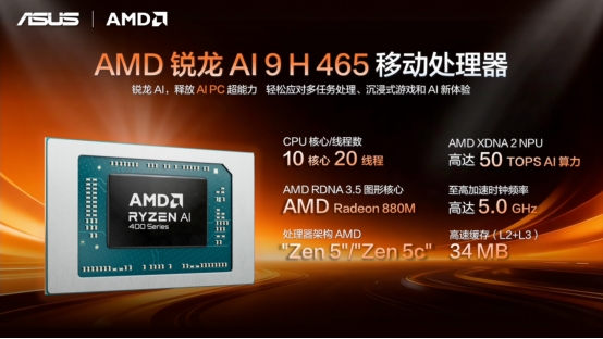 随后,AMD大中华区家用产品市场总监 廖金宁 讲解了华硕全系新品搭载的全新AMD锐龙AI平台,包括锐龙AI Max+系列以及AI 400系列的性能优势。其中,AMD锐龙AI Max+ 395处理器提供工作站级的创意性能、沉浸式3A游戏体验以及便携的AI工作站属性;AMD锐龙AI 9 H 465处理器,带来"Zen 5"/"Zen 5c"全新CPU架构与至高50 TOPS NPU AI算力,释放AI PC超能力,并以高能效比表现带来领先的AI性能体验。